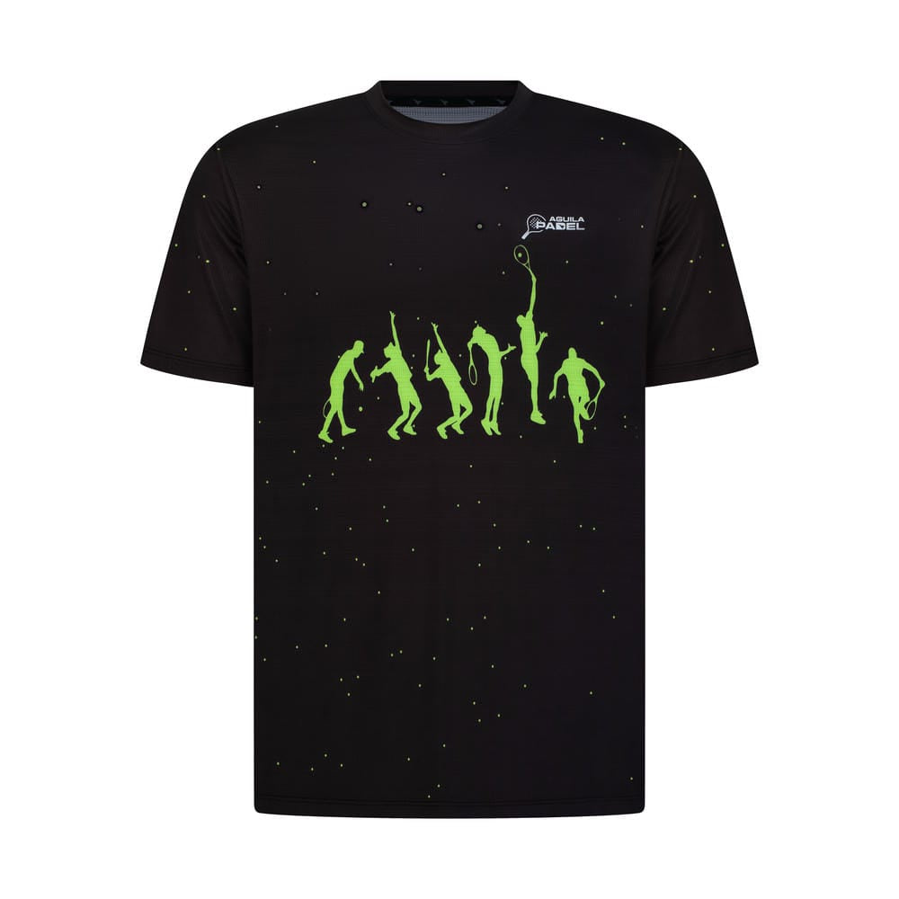 Channel the spirit of progress and power on the padel court with the Aguila Padel Men's Evolution Graphic Performance T-Shirt in Black with Neon Green accents. This captivating short-sleeve crew-neck tee reimagines the iconic "evolution of man" motif—reinterpreted as dynamic padel players evolving from primitive swings to masterful overheads—set against a cosmic black backdrop dotted with glowing green stars. It's a bold, motivational design that celebrates the journey of skill, agility, and dominance in padel, making it perfect for players who want to stand out with style and meaning during intense matches, training, or casual wear.