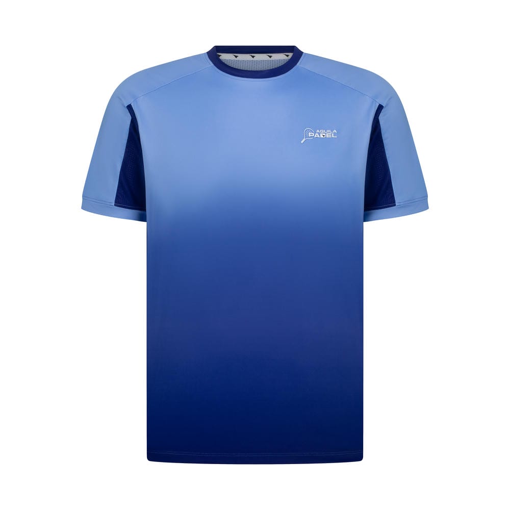 Elevate your padel game with cool confidence in the Aguila Padel Men's Gradient Performance T-Shirt in Sky Blue with Navy Fade. This refreshing short-sleeve crew-neck tee is engineered for padel players who value smooth style, superior comfort, and peak performance under pressure. The elegant gradient flows seamlessly from light sky blue at the shoulders into a deep navy base, creating a clean, modern fade that exudes calmness, precision, and contemporary athletic flair—ideal for standing out with sophistication during matches, training sessions, or everyday active wear.