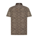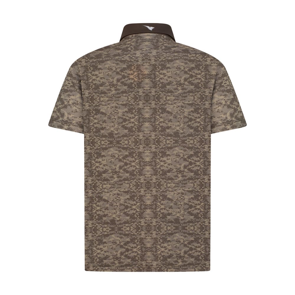 Blend into the terrain with stealthy style in the Aguila Golf Men's Moderno Camo Short-Sleeve Performance Polo Shirt in Desert Brown. This tactical-inspired design features an all-over digital camouflage print in earthy brown, tan, and khaki tones, delivering a rugged yet refined aesthetic perfect for the modern golfer who appreciates understated edge. The solid dark brown collar and three-button placket create sharp contrast, while a discreet embroidered white eagle-wing logo on the back yoke and a woven Aguila tag on the left sleeve add authentic branding. Engineered from lightweight micro-stretch performance fabric, this polo ensures superior breathability, moisture-wicking, and full mobilityโkeeping you cool and focused whether you're navigating the fairway or the clubhouse. Ideal for transitional seasons and versatile layering.