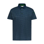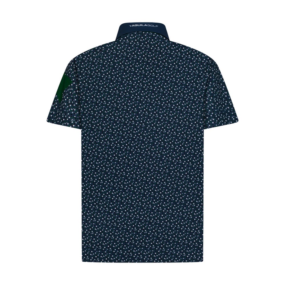 Light up the links with the Aguila Golf Men's Moderno Starfield Short-Sleeve Performance Polo Shirt in Navy. This celestial-inspired design features a rich navy base scattered with tiny white star-like micro-dots, creating a subtle yet striking night-sky effect that adds depth and movement to every swing. A contrasting navy collar with green underlay and matching green buttons elevates the look, while bold green eagle-wing embroidery on the left sleeve and โAGUILA GOLFโ branding inside the back collar deliver signature flair. Crafted from ultra-light micro-stretch performance fabric, it ensures exceptional breathability, moisture management, and unrestricted mobilityโideal for all-day play in any weather. Pair it with solids or patterns; this polo brings modern edge and technical excellence to your golf wardrobe.