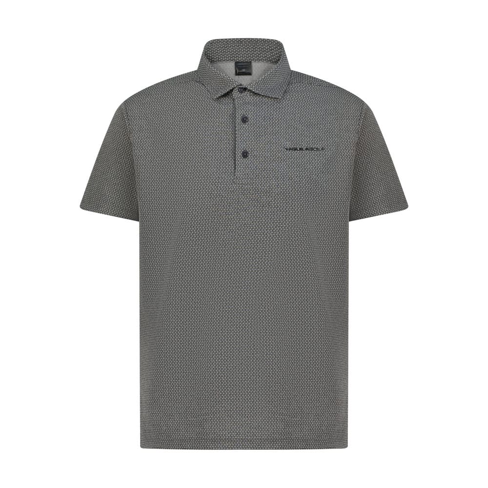Dominate the course with quiet confidence in the Aguila Golf Moderno Classic Charcoal Men's Short-Sleeve Performance Polo Shirt. Expertly woven from 200 GSM premium Lycra with a refined all-over micro-dot jacquard pattern in a deep, versatile charcoal tone, this polo delivers elite-level breathability, four-way stretch, and rapid moisture control to keep you cool and in control. Subtle yet sharp branding includes a sleek black embroidered โ€œAGUILA GOLFโ€ logo on the left chest, a structured self-fabric collar with inner contrast taping, and a clean three-button placket with matte black buttons. The athletic tailored fit features side vents for unrestricted swing mechanics and built-in UPF protection for long days in the sun. Quick-drying, wrinkle-resistant, and built to last, this polo transitions effortlessly from the 19th hole to evening outings with timeless sophistication.