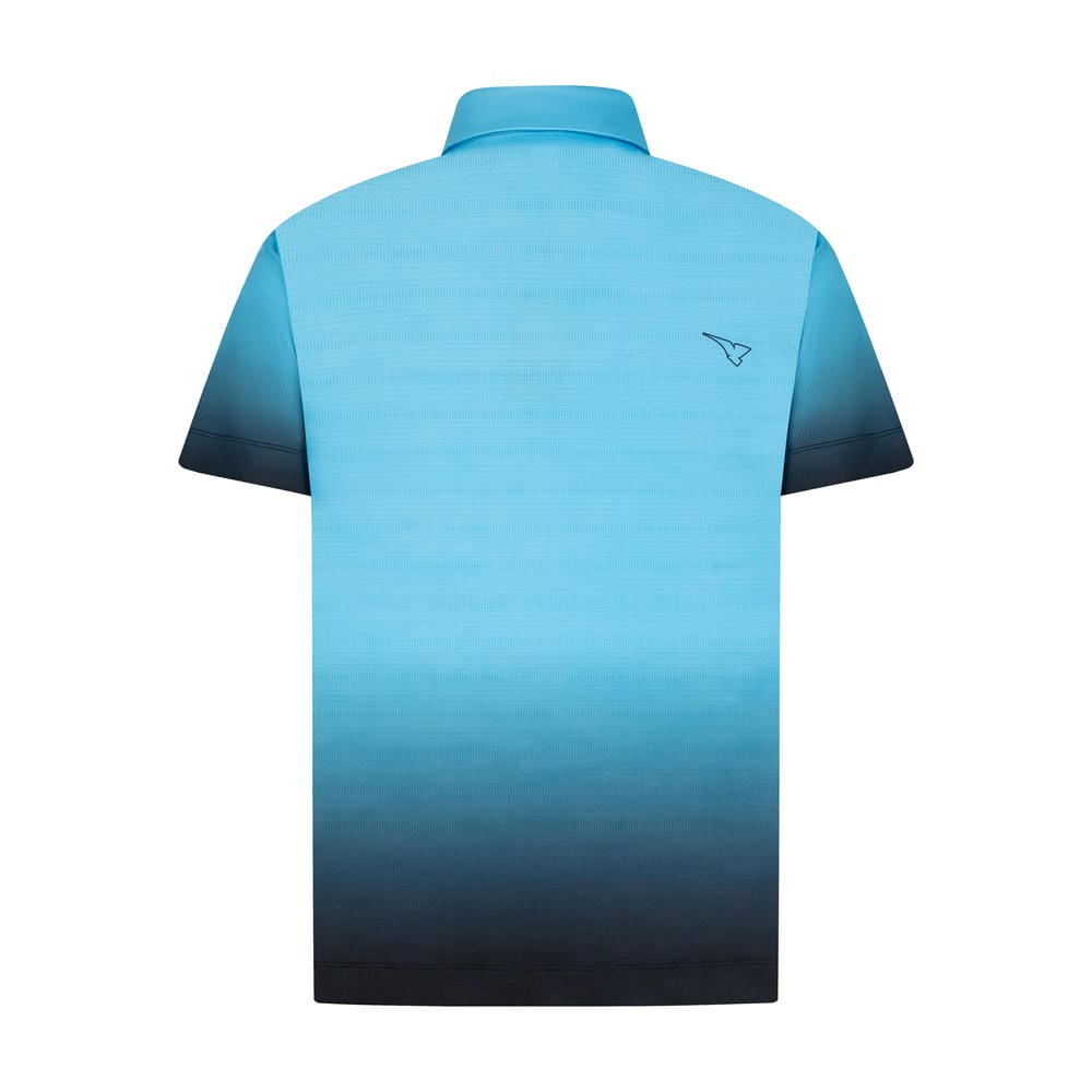 Dive into effortless style with the Aguila Golf Moderno Ocean-to-Navy Ombré Performance Polo Shirt. This striking short-sleeve polo features a seamless ombré gradient that transitions from vibrant light ocean blue at the shoulders to deep navy at the hem—achieved through advanced full sublimation for a smooth, fade-proof finish that won’t crack or peel. Crafted from premium lightweight Lycra (200 GSM), it delivers exceptional 4-way stretch, superior moisture-wicking, and rapid-dry technology to keep you cool and dry from the first swing to the final putt. The matching ocean-blue collar, tonal "Aguila Golf" embroidery on the chest, minimalist eagle logo at the back neck, and sleek pearlized three-button placket create a modern, tour-ready silhouette built for unrestricted mobility and standout sophistication.