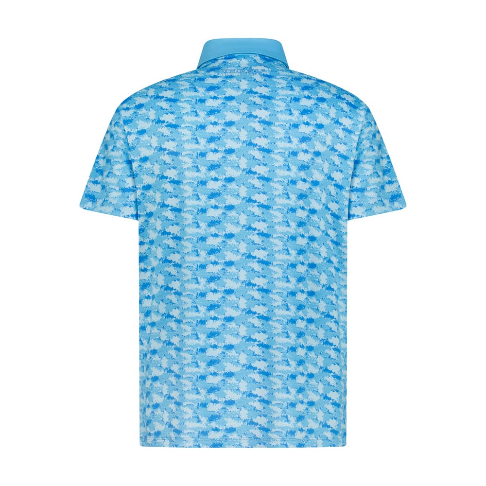 Blend into the fairway with bold, playful camouflage in the Aguila Golf Moderno Sky Blue Golf Cart Camo Printed Performance Polo Shirt. This vibrant short-sleeve polo features an all-over camo pattern composed of tiny white golf carts scattered across a bright sky blue baseโexecuted through premium full sublimation for vivid, fade-resistant graphics that stay sharp round after round. Crafted from lightweight, high-stretch Lycra (200 GSM), it delivers exceptional 4-way mobility, superior moisture-wicking, and rapid-dry technology to keep you cool and focused from the first tee to the clubhouse. The matching sky blue collar with "Aguila Golf" embroidery at the back neck, subtle tonal eagle logo on the chest, and pearlized three-button placket create a fun yet polished look built for performance and personality.